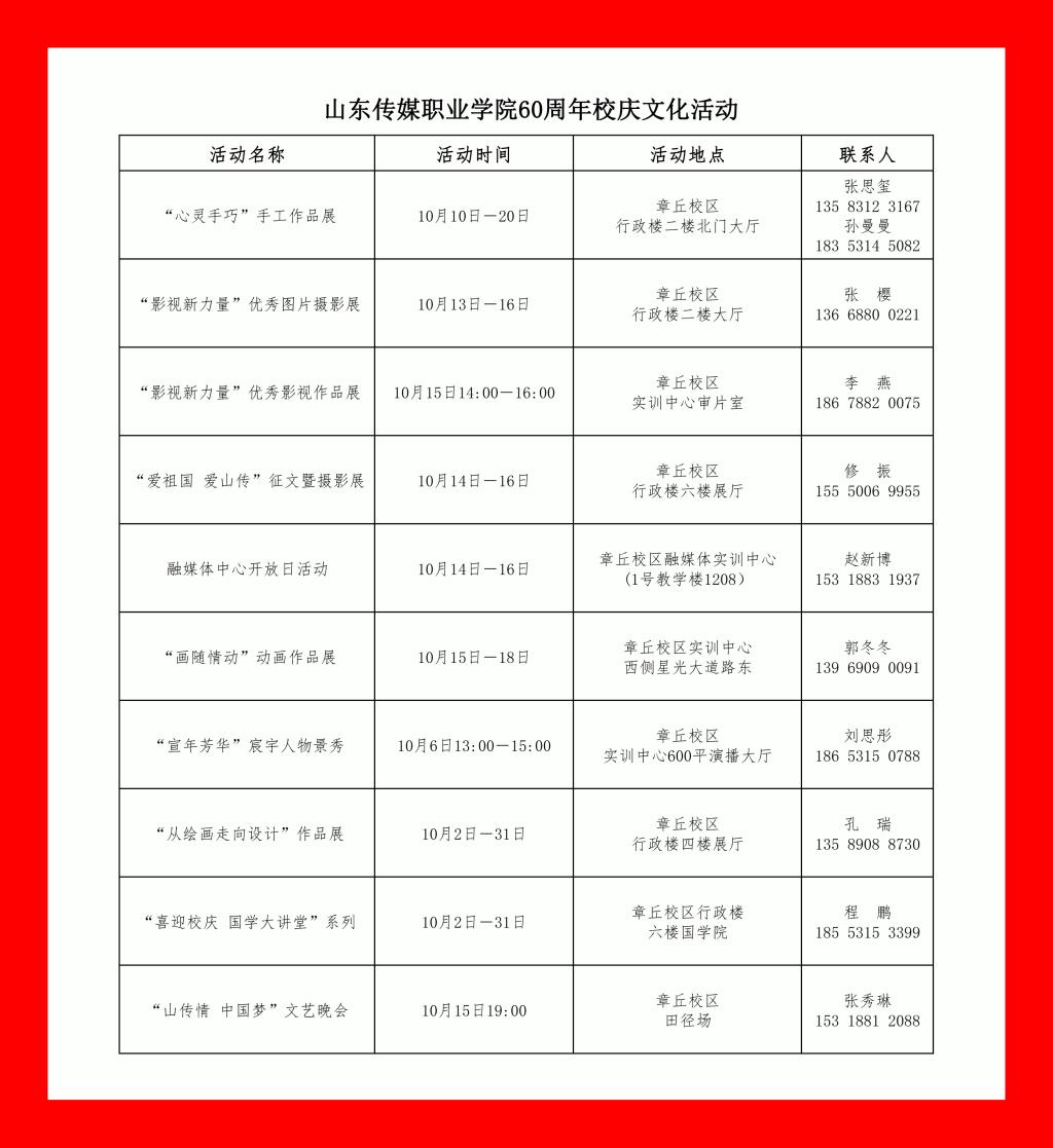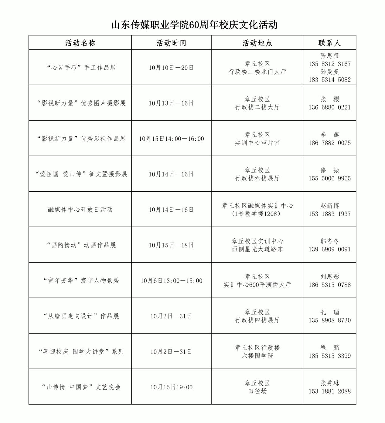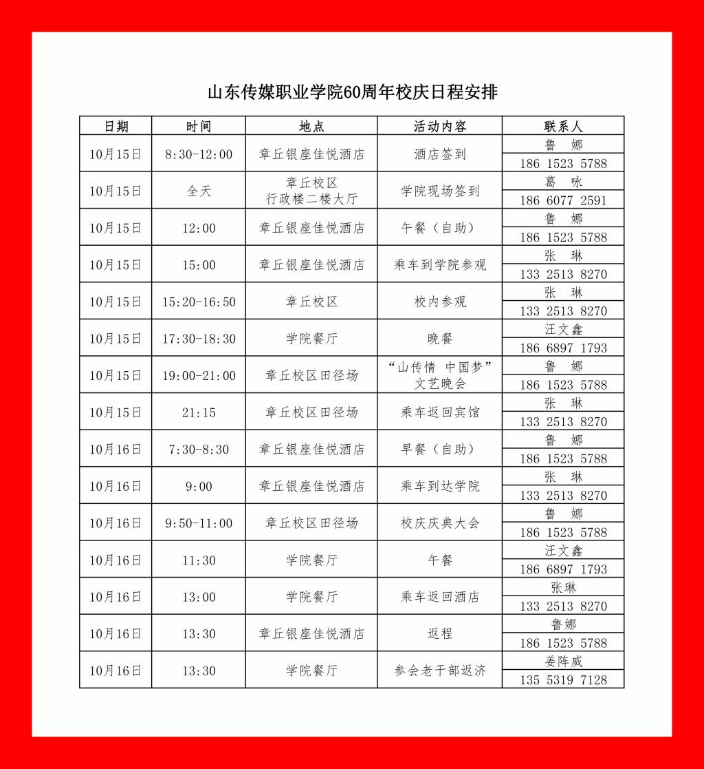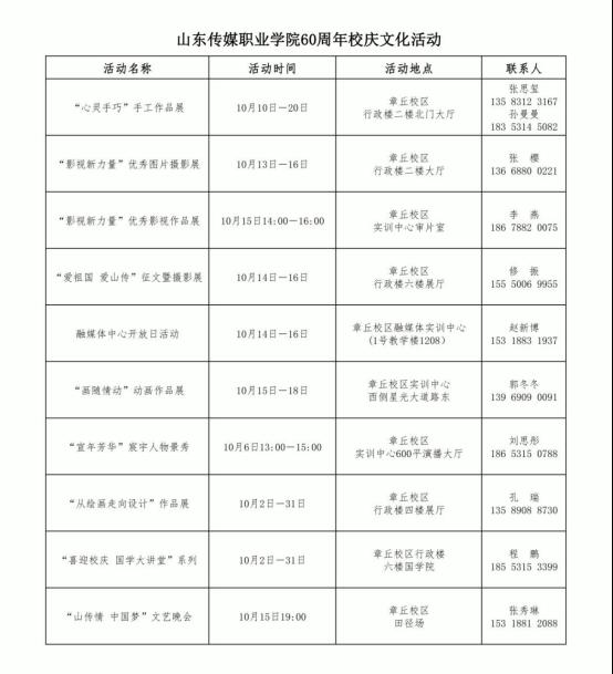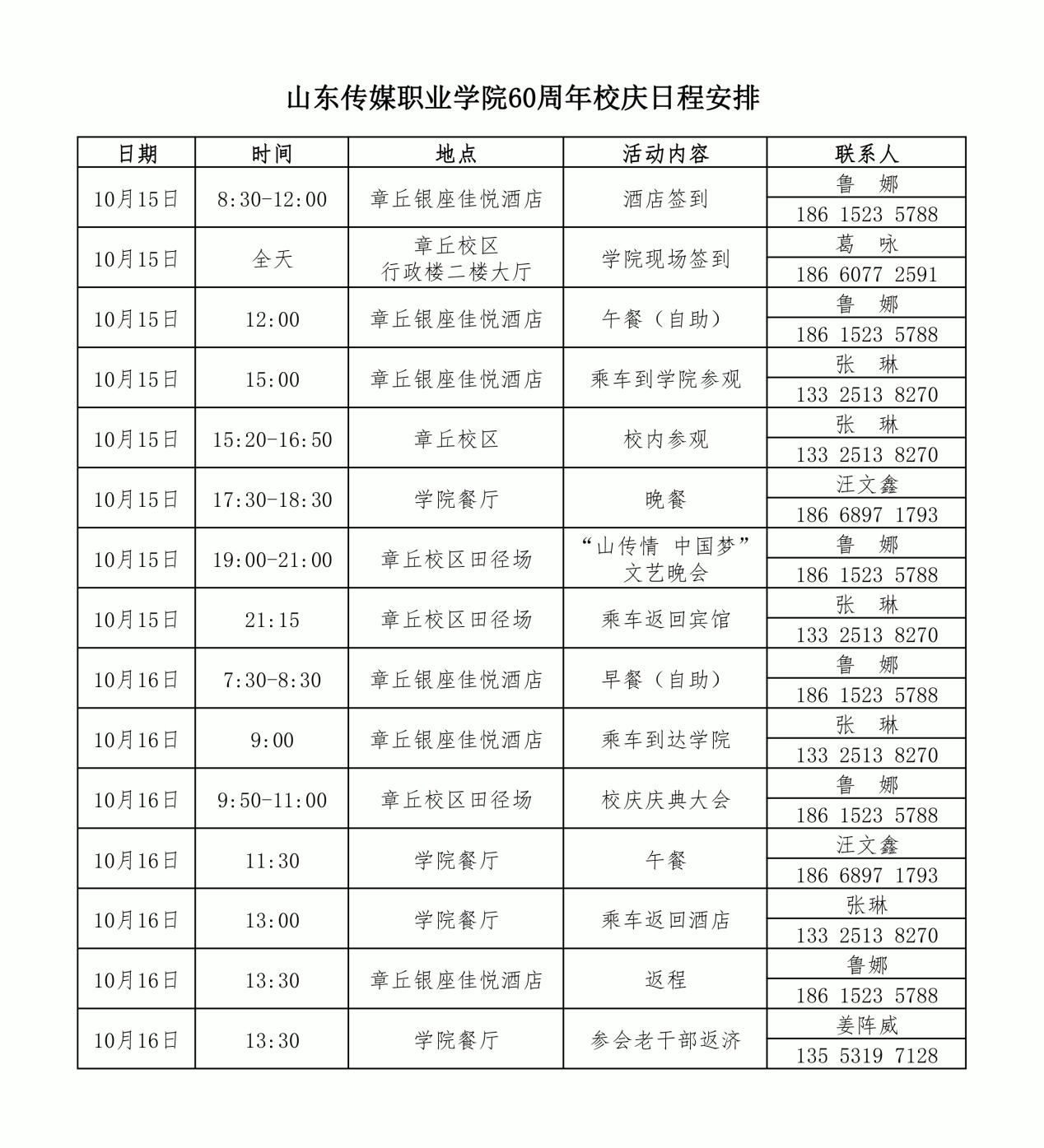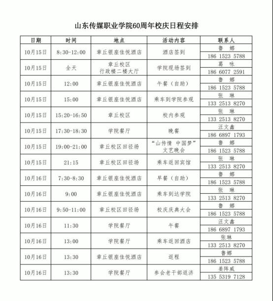 甲子校庆,如约而至。建校60周年是山东传媒职业学院发展的重要里程碑,是山传迈向新征程的新起点;也是全体山传人畅叙师生之情、同窗之谊,展示山传风采的重要时刻;更是汇集才智、凝聚力量、共商发展大计的重要契机,学院将举办建校60周年系列庆祝活动。为方便各界宾朋和广大校友参加各类活动,现将校庆期间相关事宜公告如下:
