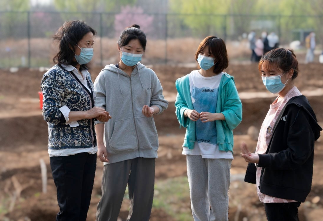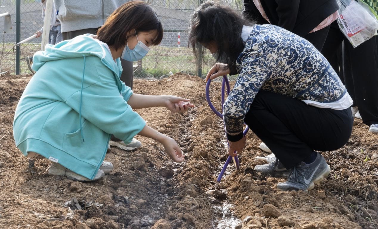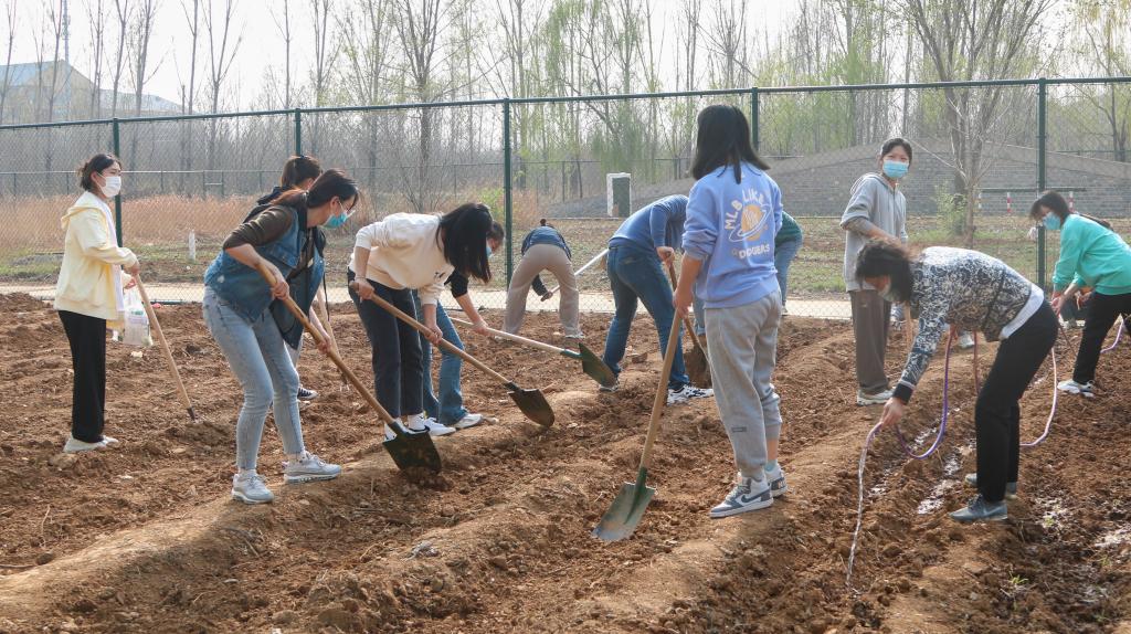 劳动中,孙茜芸给同学们讲解不同蔬菜的生长差异、播种覆土的耕种技巧,大家分工协作,挥锹铲土、培土固垄、提水浇灌,一派繁忙景象,先后种植了油麦菜、大葱、南瓜、菠菜、芸豆等品种,并为播种的菜地立起标志牌。在忙碌的同时,孙茜芸向同学们了解封校期间生活起居、核酸检测、线上教学等情况,并叮嘱大家务必做好防护,健康快乐学习、生活。