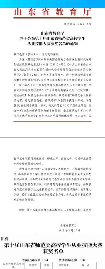 2月10日至12日,由山东省教育厅主办,青岛大学承办的第十届山东省师范类高校学生从业技能大赛省级决赛圆满落幕。学前教育与戏剧系参赛学生2020级高淑君在本次大赛中荣获一等奖,实现了我院学前教育专业学生技能大赛奖项新突破。