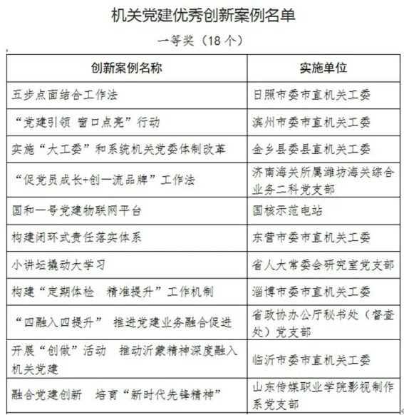 近日,由山东机关党建研究专委会、山东机关建设网、齐鲁晚报·齐鲁壹点党建频道联合发起机关党建创新案例征集评选活动结果出炉。经山东省委省直机关工委、山东省委党校(山东行政学院)和齐鲁晚报·齐鲁壹点三方专家认真评选,经山东省机关党建研究专委会研究确定,由山东省广播电视局报送的山东传媒职业学院影视制作系党支部的创新案例《融合党建创新 培育“新时代先锋精神” 》在152个案例中脱颖而出,荣获全省机关党建优秀创新案例一等奖。