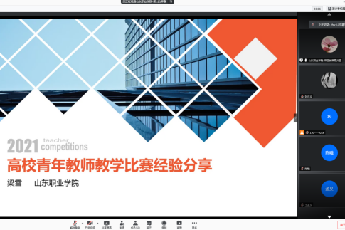 本次专题培训采取线上形式进行,梁雪老师以《高校青年教师教学比赛经验分享》为题,从青年教师教学比赛基本情况、比赛准备以及需要重视的细节等方面进行了分享,就各教学阶段准备、教学资料准备、教学技巧设计及课堂把控等方面进行了指导,同时还就教学比赛中如何贯彻“职教二十条”、体现社会热点内容和课程思政元素融入提出了自己的意见和建议。