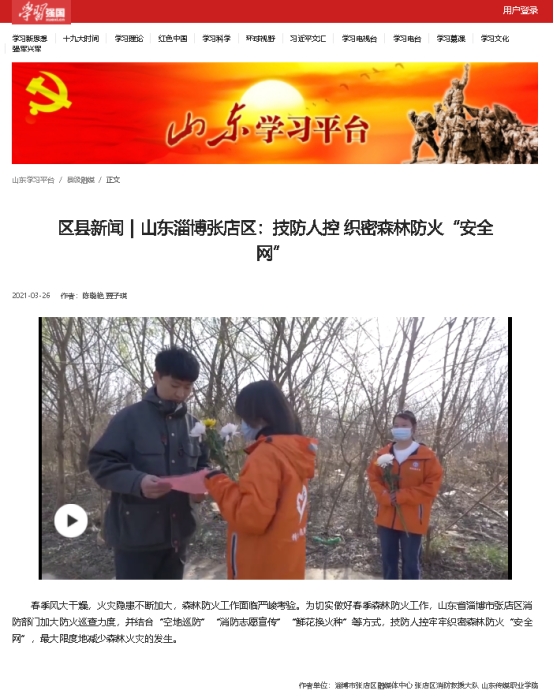 近日由山东传媒职业学院影视制作系党总支联合淄博市张店区融媒体中心、张店区消防救援大队组织拍摄的森林防火宣传片登上了学习强国的平台,并被中国应急管理、淄博新闻等多家新媒体平台转发。