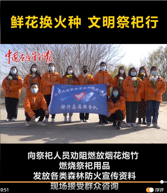 影视制作系作为张店区消防救援大队的共建单位,发扬“新时代先锋服务精神”,组织专业技术团队参与了“鲜花换火种”环节的拍摄与制作,并组织部分师生开展森林防火志愿宣传活动,积极实现了专业技术技能与社会服务的衔接。