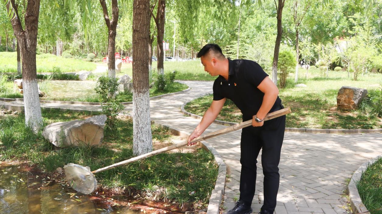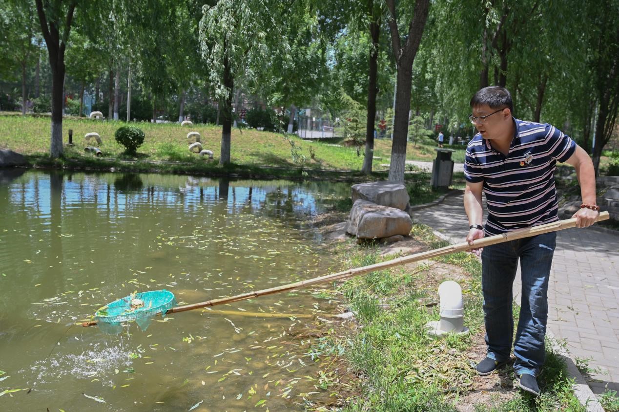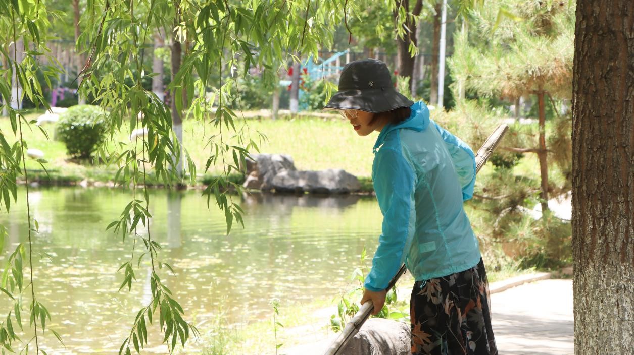 烈日当空,骄阳似火,春华园里尽是教师们劳动的身影。打扫路边的枯叶,捡拾小路上的垃圾,打捞人工湖里飘落的杂物......教师们充分发扬不怕苦不怕累的精神,自行分散在春华园各个角落,行动积极,井然有序,迅速开展不同的劳动任务。经过近一个小时的打捞和清理,春华园内的自然环境焕然一新,小路干净整洁,路边花草错落有致;湖水清澈见底,游鱼小虾隐约可见,教师们打扫成效可见一斑。