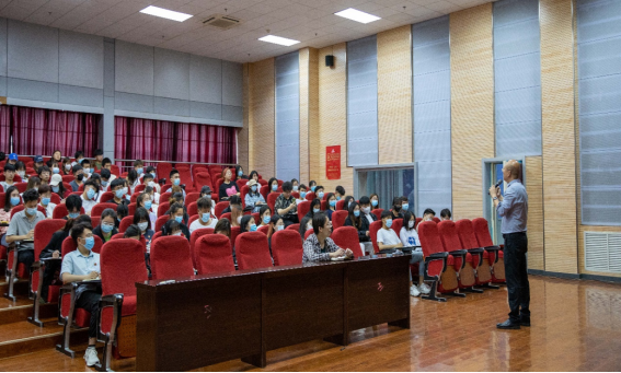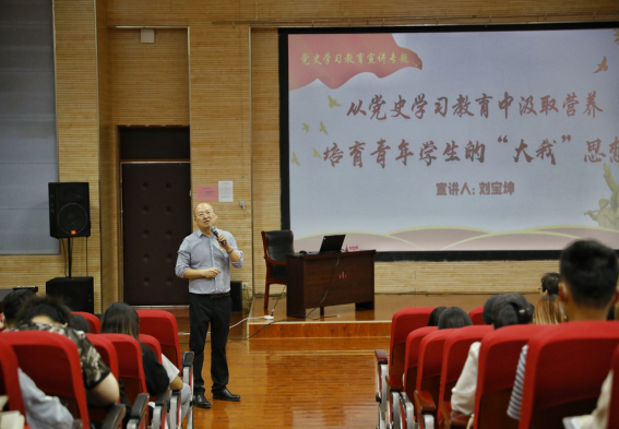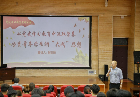 刘宝坤书记从培养青年学生的“大我”思想入手,介绍了培养“大我”思想的三个维度。第一个维度是大爱,生命无比可贵,要穷极一生把爱传递,回报父母、回馈社会;第二个维度是大德,“地势坤,君子以厚德载物”,围绕着“厚德载物”,指出必须要修好德行,作为新时代的大学生应该从政治品德、职业道德、社会公德、家庭美德四个方面来丰厚自己的德行,引导全体学生争做有道德的青年人。第三个维度是大任,“天行健,君子以自强不息”,指出了担当的必然性,要求全体学生弘扬社会主义核心价值观,做社会主义核心价值观的坚定信仰者、积极传播者、模范践行者。