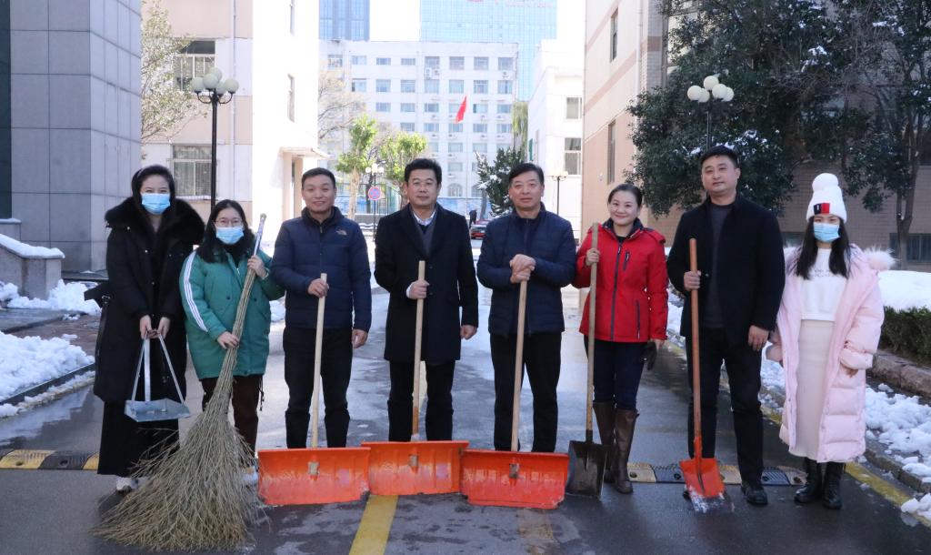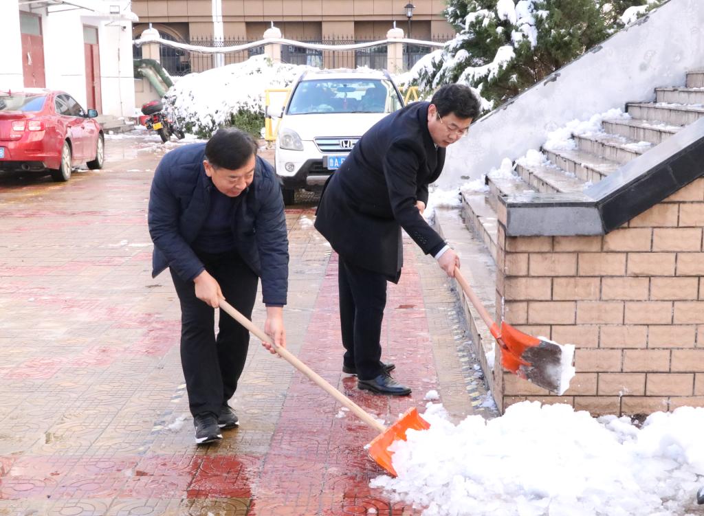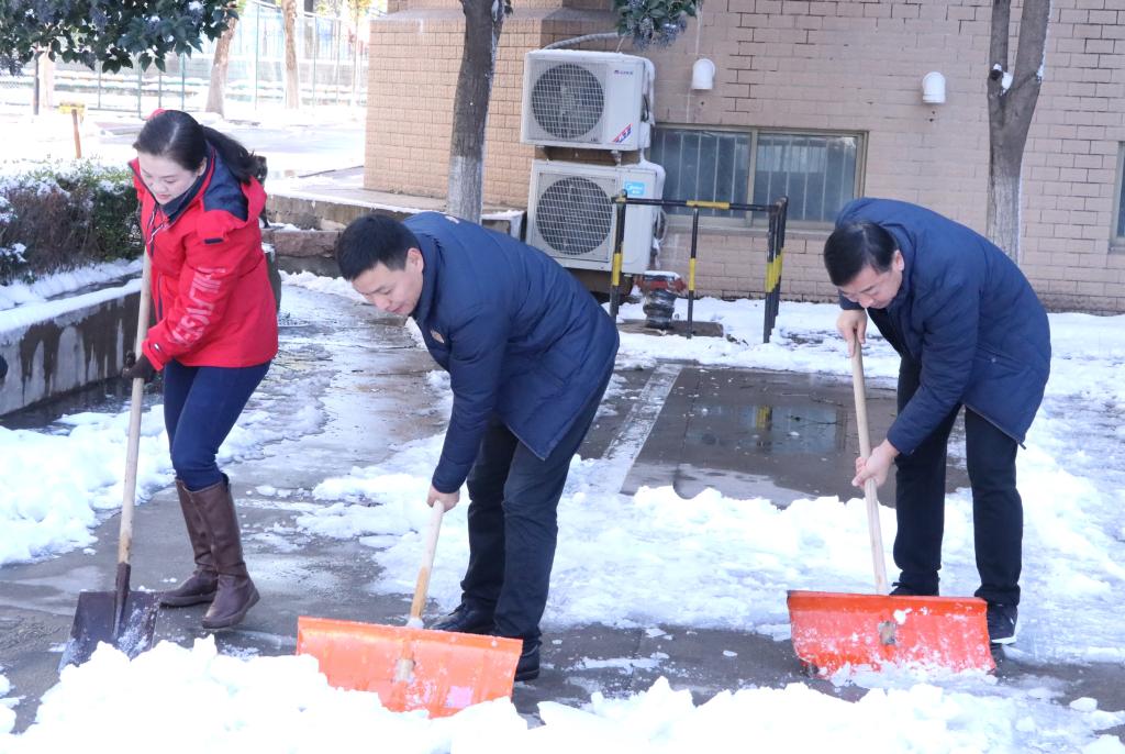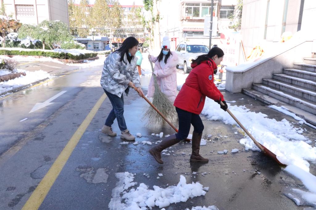 大家手拿铁锨、扫帚等工具,从学院主干道开始,依次由北向南逐一清理积雪。扫雪现场,老师们齐心协力,配合默契,干得热火朝天。虽然室外温度很低,但大家劳动的热情和团结协作的力量让这个冬日变得格外温暖。经过大家的努力,学院主干道路和教学楼前的积雪基本清扫干净,为全院师生开辟了一条洋溢着暖暖温情的方便之路,保证了师生的出行安全。