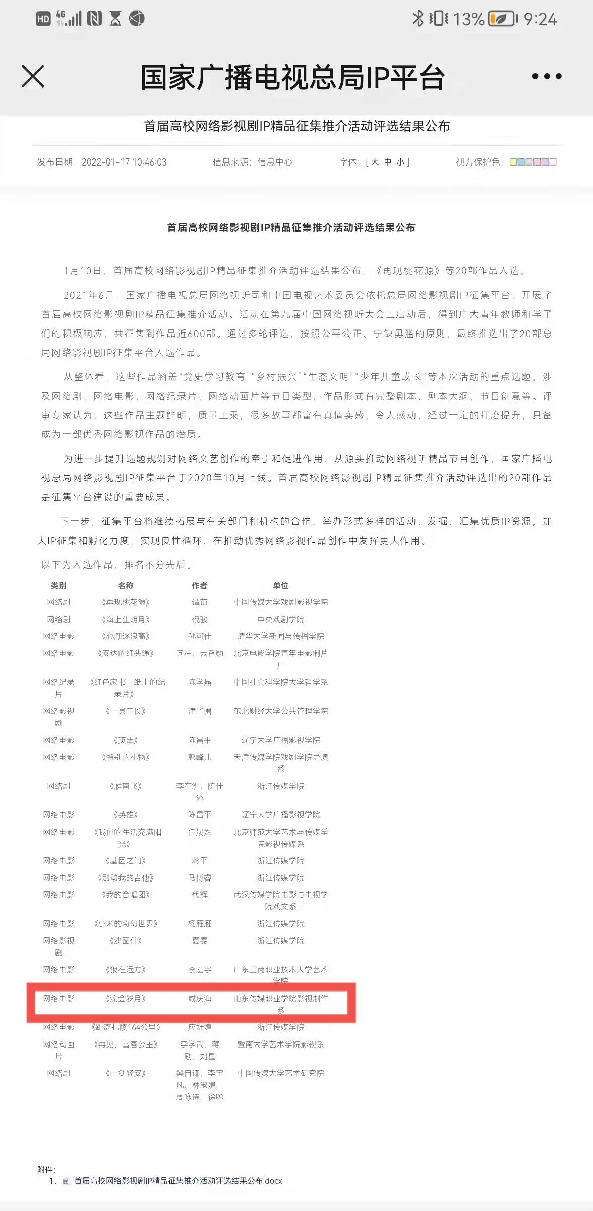 本次活动征集的作品涵盖“党史学习教育”“乡村振兴”“生态文明”“少年儿童成长”等多个选题,涉及网络剧、网络电影、网络纪录片、网络动画片等节目类型。作品《流金岁月》是本次活动入选的唯一高职院校作品,也是山东省各高校唯一入选作品。接下来,该作品将在广电总局网络平台进行孵化和推送,招募全国各界投资,有望拍摄制作成网络电影作品。