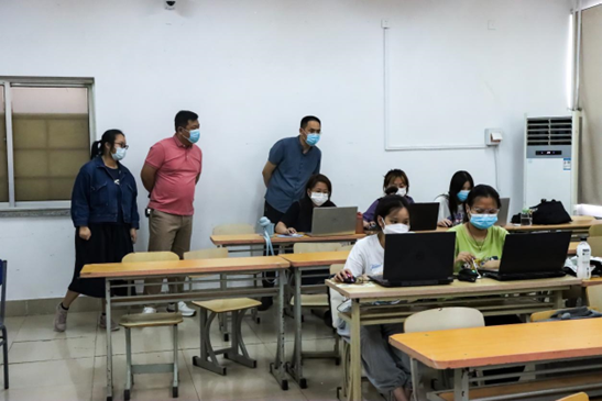 韩丙论一行深入了解了课堂教学状况,对疫情防控、教学效果、学生出勤等事项进行了重点检查,并就教学运行过程中出现的问题与各任课教师进行了交流。教室里,同学们自觉佩戴口罩、保持间距,积极配合疫情防控管理要求。各教学区域干净整洁,教学设施运行正常,沉静了一个多月的教室再次活跃起来,热烈讨论声、笑声和掌声萦绕课堂。
