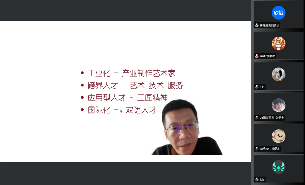 谢宁强调,行业需要的是工业化人才(产业制作艺术家)、跨界人才(艺术+技术+服务)、应用型人才(工匠精神)和国际化人才(双语人才),希望学生们在学校努力学习,成为高质量的国际化复合型人才。精彩的演讲、身边的案例、幽默的言语,引起现场师生们的浓厚兴趣。