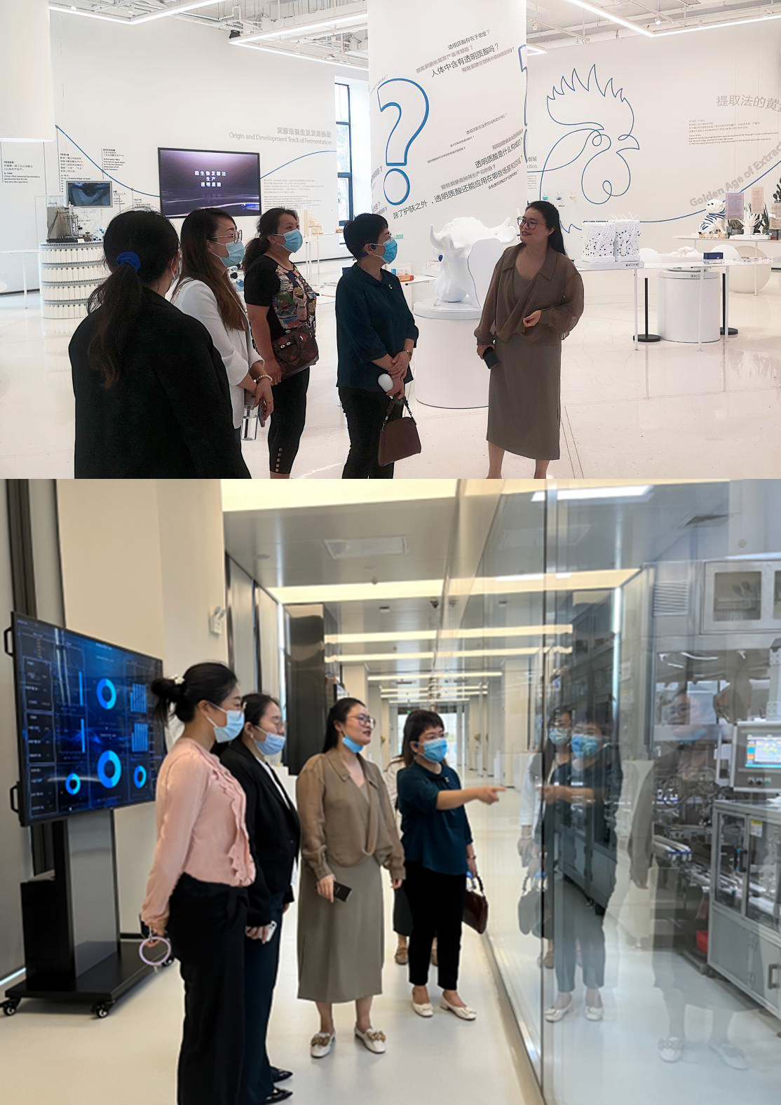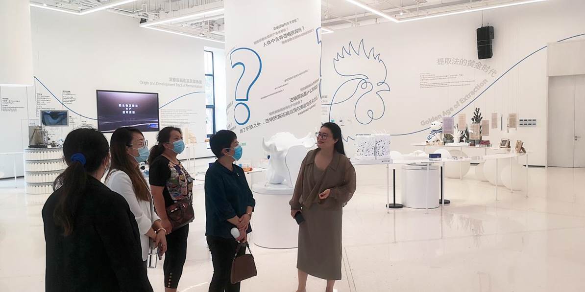随后,宋雪一行到世界透明质酸钠博物馆参观。博物馆采用全景化的呈现形式,全面运用科普视频、文献史料、仿真模拟等多种形式,调研团队详尽了解了透明质酸钠俗称玻尿酸的前世今生在美容、医疗、食品中的应用发展,探索华熙生物工厂,了解化妆品的工业流程和前端的生物科技。