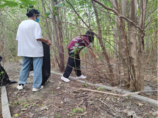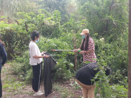 9日12点30分,读书协会42名师生从行政楼门前集合,经过简单的活动部署后,一起前往校园西南角的小树林。这里暗藏着各种白色垃圾,是环境清扫的死角,与校园的美观极不协调。在学院党委委员、院长助理尹纪瑜和图书馆指导老师的带领下,经过同学们近1小时的奋战,扫除了深藏树林的纸盒、废纸、塑料袋等。活动时值正午,同学们冒着中秋炎热和蚊虫盯咬,拿着垃圾袋、夹子,相互配合,认真清理,有的甚至徒手捡拾,不放过任何一个角落,表现了同学们不怕苦、不怕累的意志品质。整个活动井然有序,大家热情高涨,在大家齐心协力下,林间小道、草坪深处已不见塑料袋、饭盒的踪影,小树林的环境焕然一新,为同学们又增加了一个学习读书的去处。